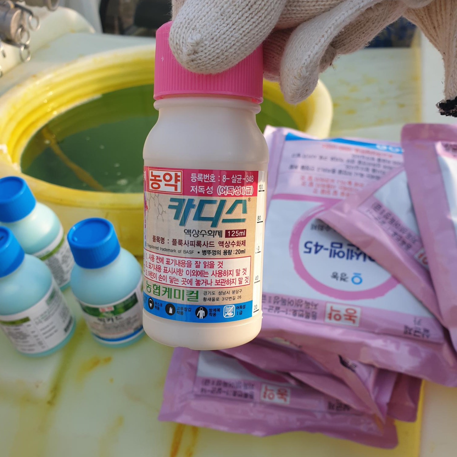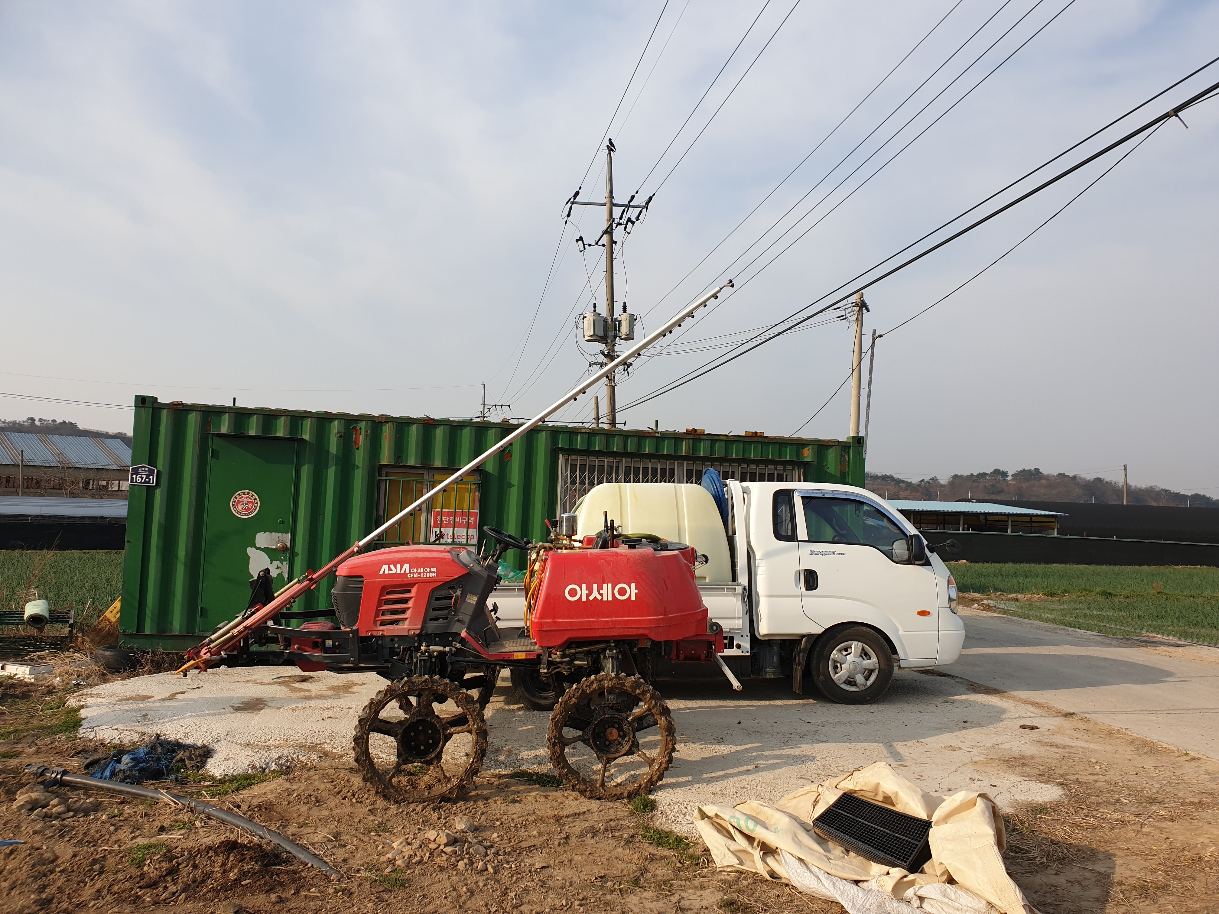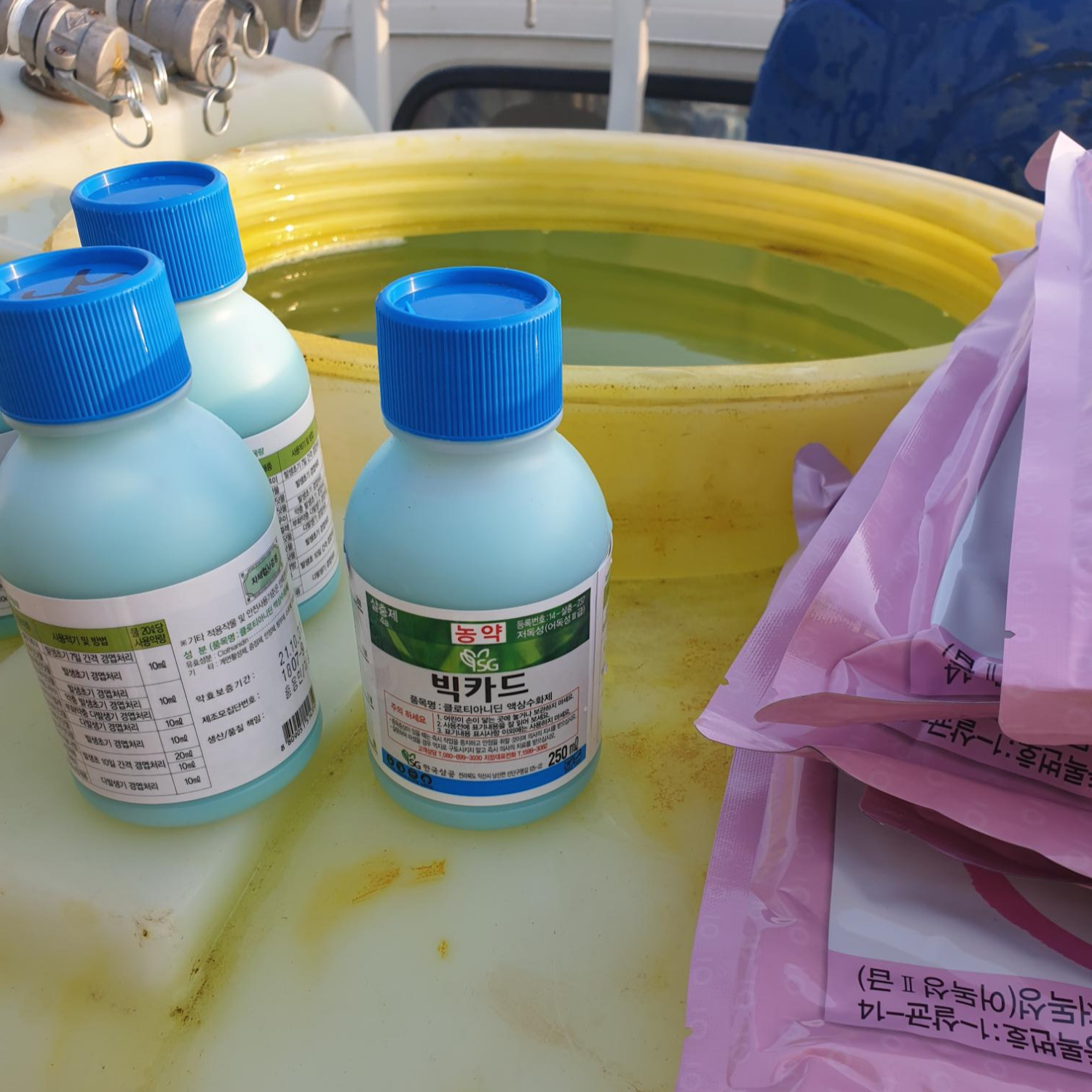 살균제를 용량에 맞게 잘 섞어 600평당 400리터의 량으로 살포했습니다.