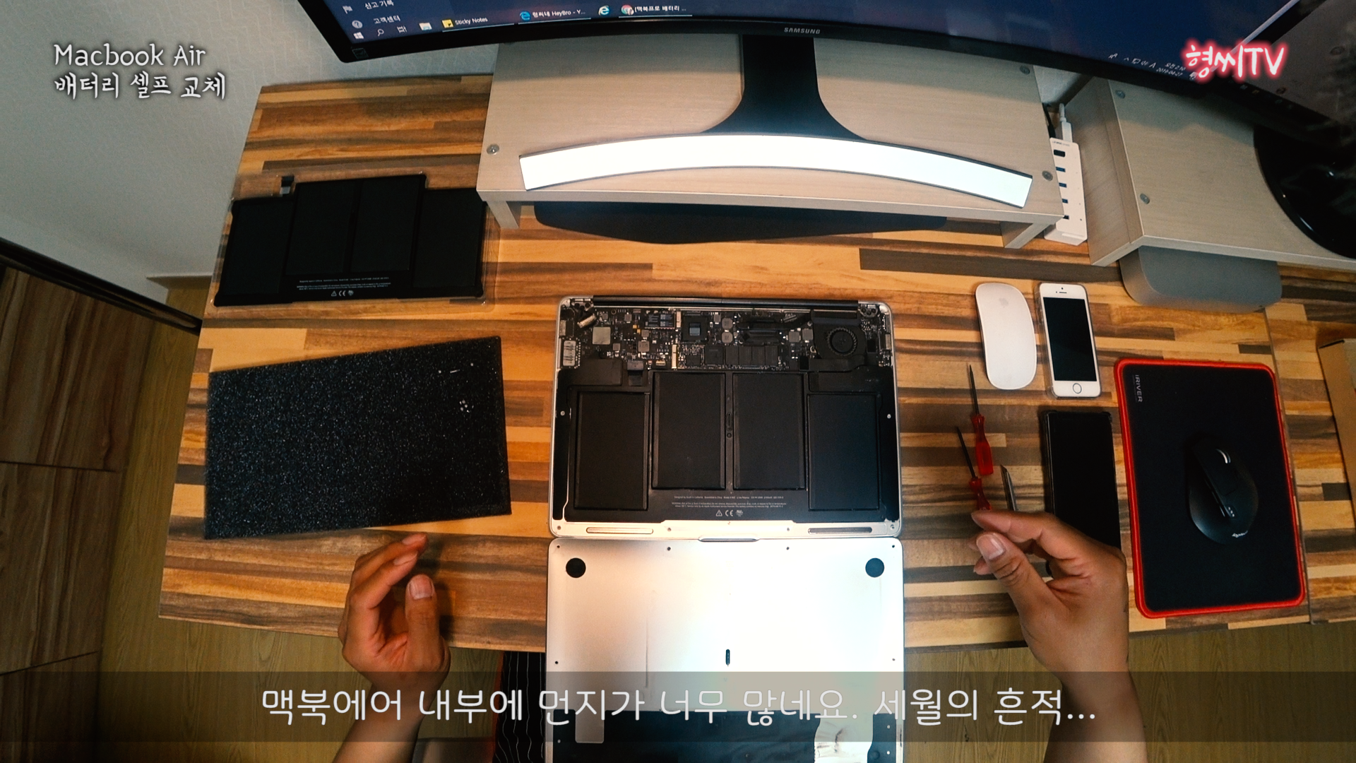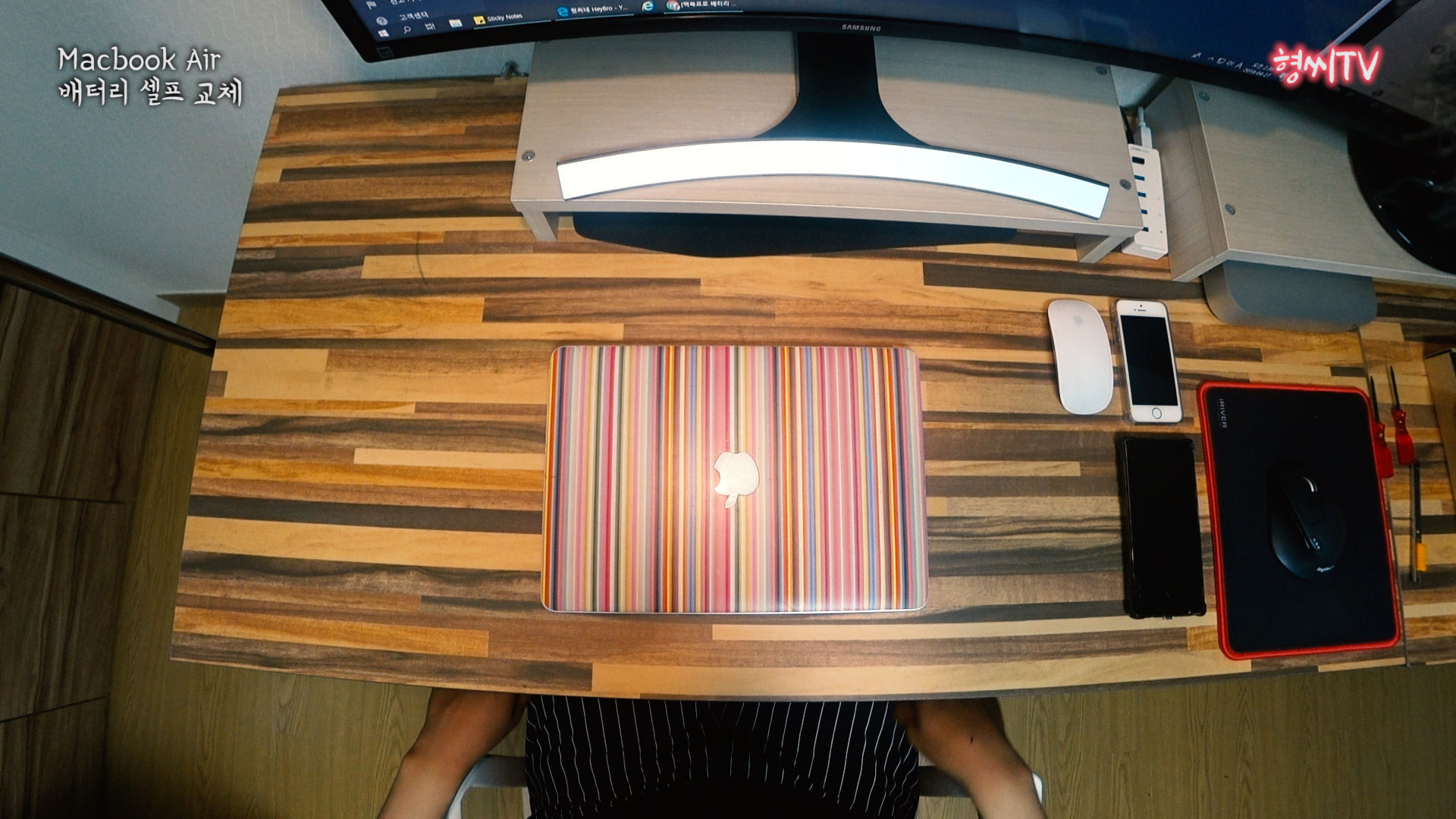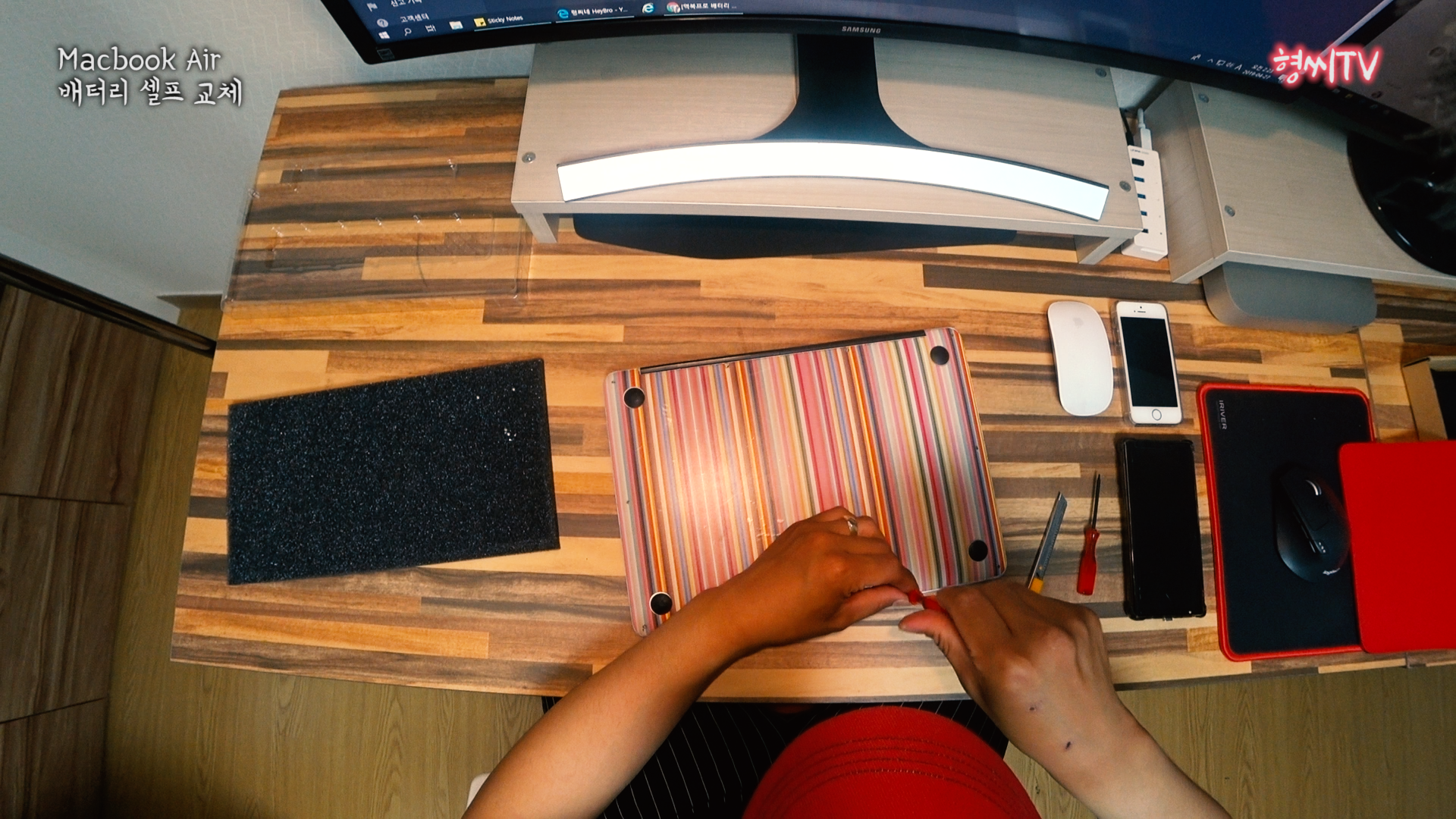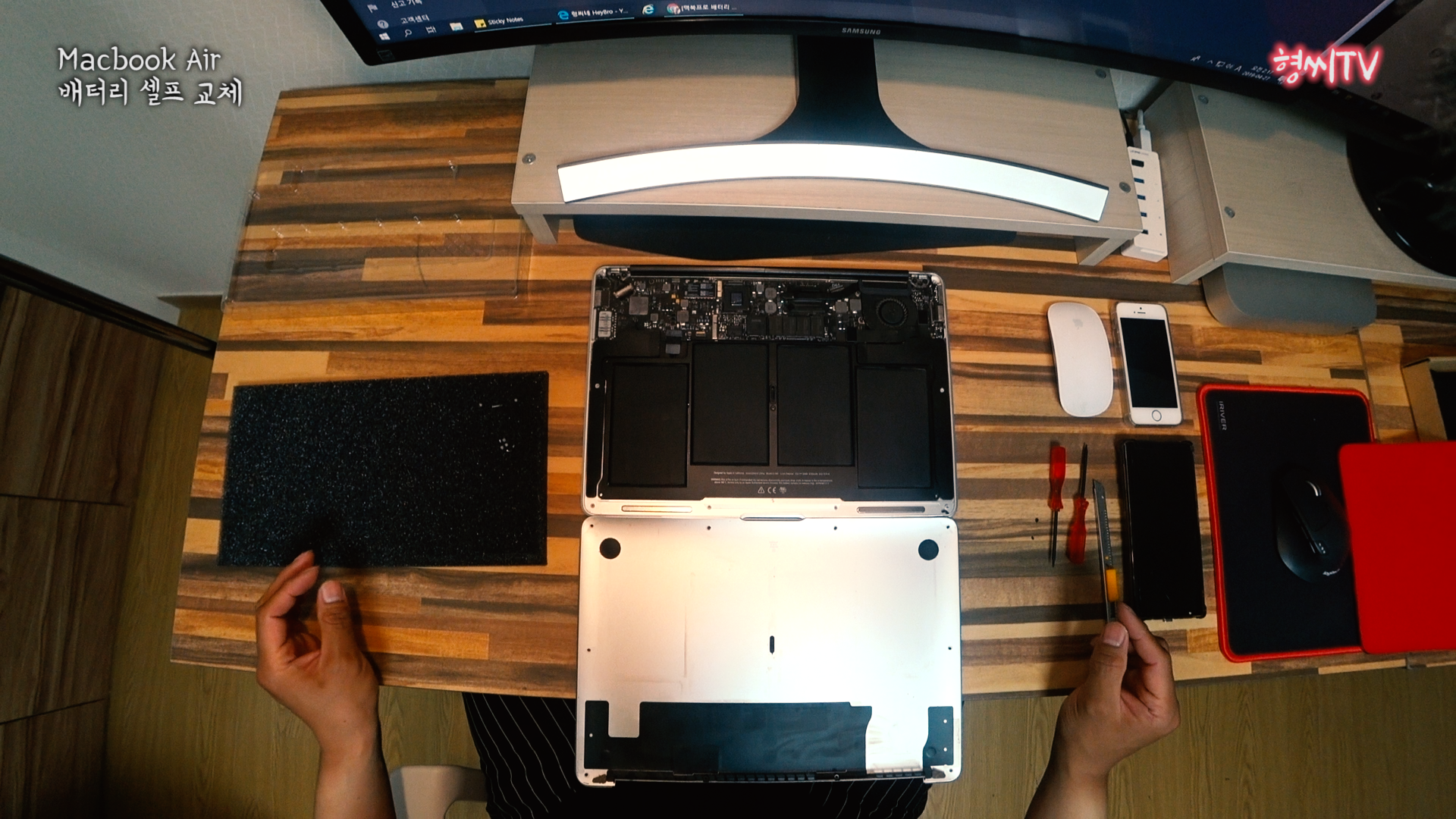 맥북 하판의 별나사를 풀어 하판을 제거해주세요.