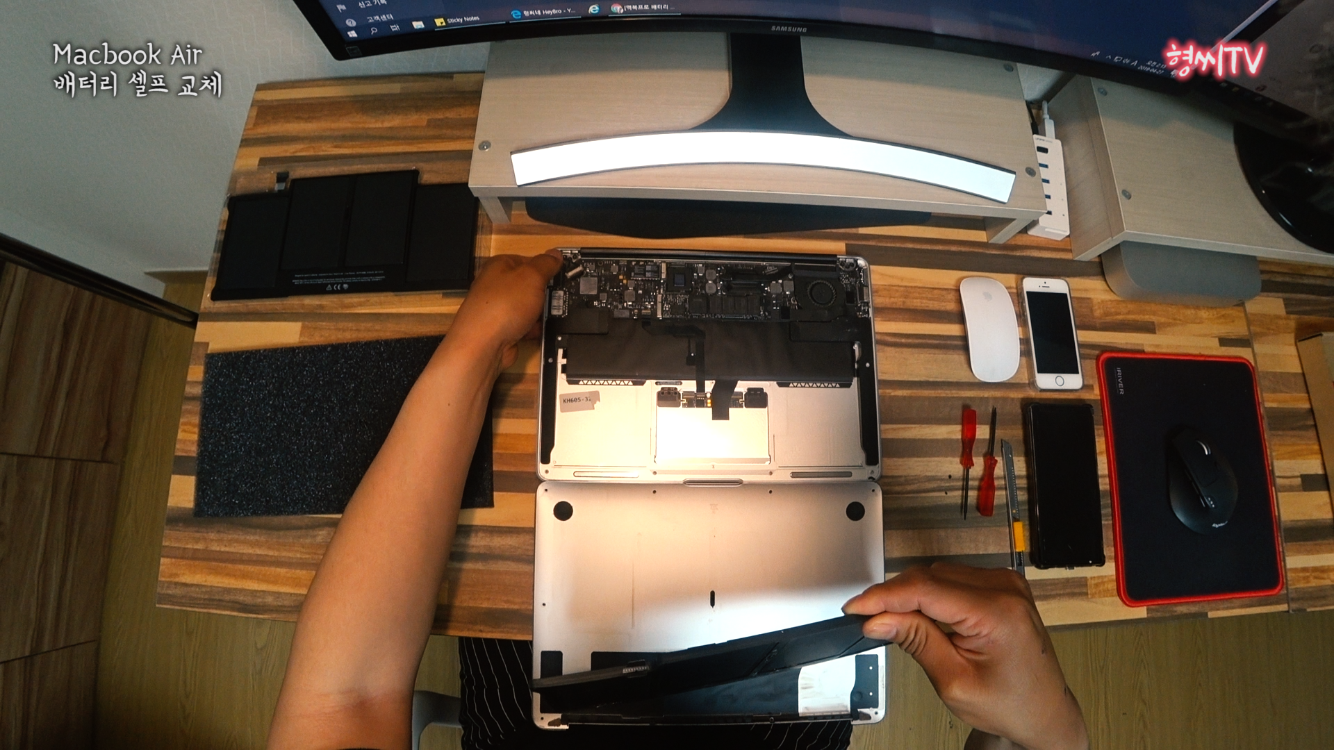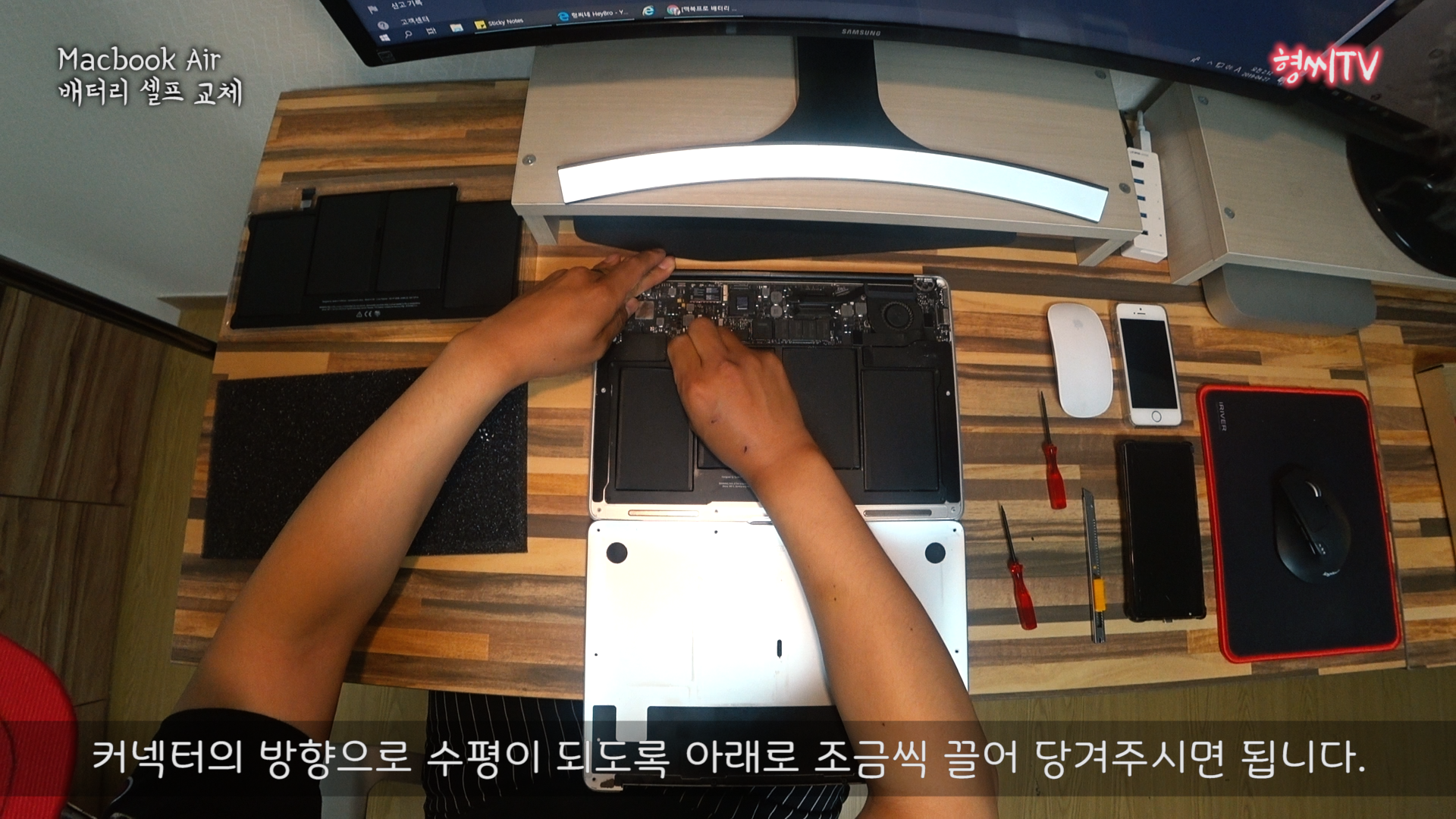 지금까지 했던 역순으로 새 배터리를 끼워주세요.